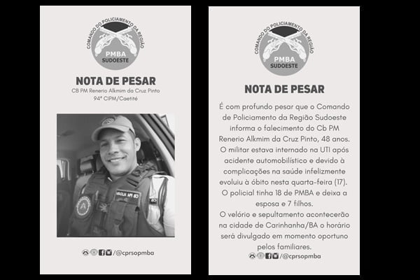A Polícia Militar da Bahia emitiu nota de pesar pelo falecimento do cabo.